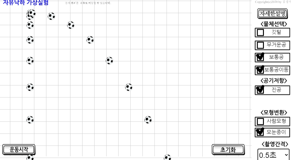 자유낙하 가상실험 프로그램이다. 아래 링크에서 실험하다 왔겠지? 안 하다 왔으면 아래 링크 눌러서 실험해 보도록 해